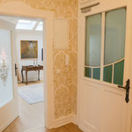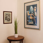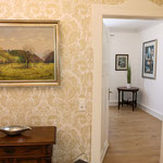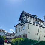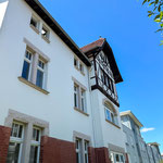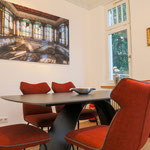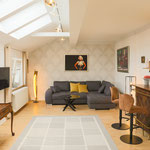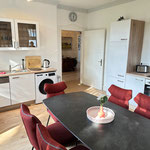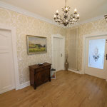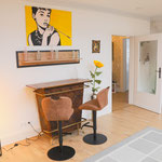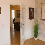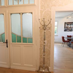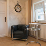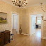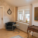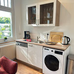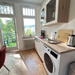 großes Wohnzimmer, geräumige und voll ausgestattete Küche mit Essbereich, Bad mit Dusche und WC, zusätzliches Gäste-WC, sonniger Balkon mit Herkulesblick in denkmalgeschützter Jugendstil-Villa, kostenfreie Parkplätze auf dem Grundstück
