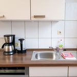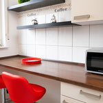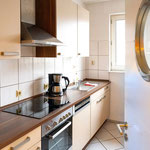 Die Küche ist vollständig ausgestattet. In der Küche gibt es außerdem einem Stehtisch mit zwei Hockern.