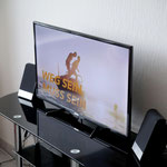 Das Wohnzimmer ist mit Flachbild-TV, DVD-Player und Hifi-Anlage ausgestattet. Hier befindet sich auch ein sehr geräumiger Essbereich sowie eine große,